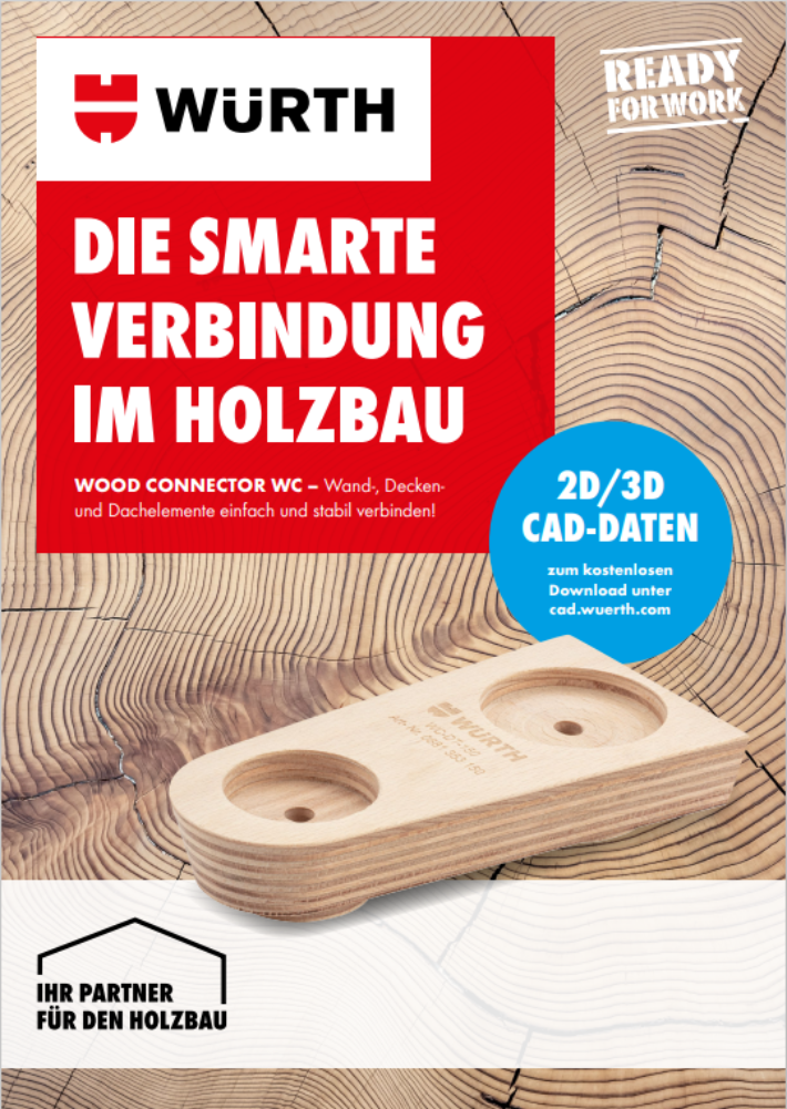 ... und altbewährte Verbindungen auf den neuesten Verarbeitungsstand gebracht. Dies ist das Ziel des aufschraubbaren Würth Wood Connector WC der auf dem Schwalbenschwanzprinzip basiert. Die konisch zulaufenden Schwalbenschwanzverbinder oder stumpfen Kegelverbinder auf Basis einer stabilen BFU 100 Trägerplatte sind ideal für den konstruktiven Verbund von Wand-, Decken- oder Dachelementen. Die Anordnung der Verbinder wird über CAD geplant. Die Positionierungslöcher und die Einhängetaschen werden im Abbund mit herkömmlichen Fingerfräsern gefertigt. Befestigt werden die Verbinder mit einer ASSY 4 PII CSMP Schraube. Um eine maximale Montagesicherheit hinsichtlich Positionierung und Ausrichtung zu gewährleisten sind die Positionierungslöcher in unterschiedlicher Größe ausgestaltet. In dem anzuschließenden Bauteil wird ein Einhängefalz mit vorgelagerter Tasche mittels CNC eingefräst. In diesen wird der Verbinder passgenau eingehängt. Die Schwalbenschwanzgeometrie in Kombination mit der vorgelagerten Tasche bietet im Vergleich zu herkömmlichen Metallverbindern ein sehr hohes Montagespiel während des Einhängeprozesses.