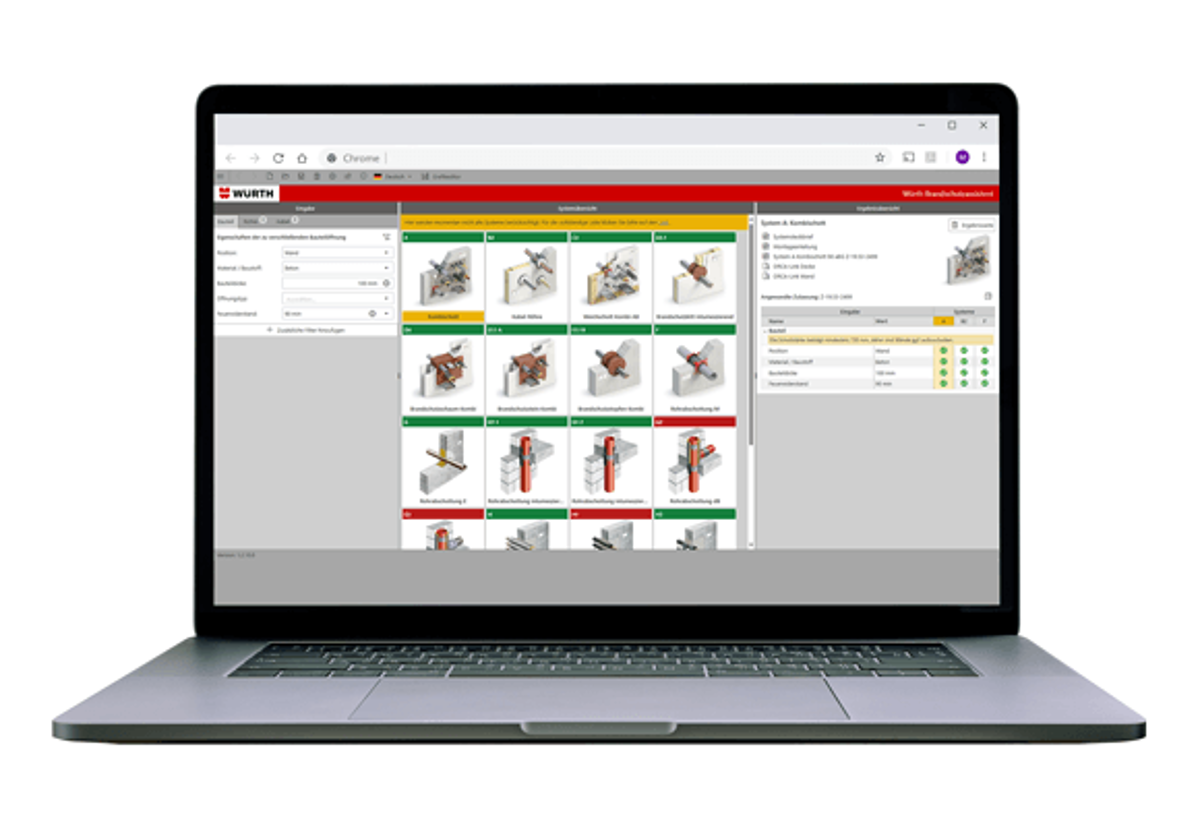 Der Würth Brandschutzassistent erleichtert diese Aufgabe: Durch Eingabe der Anforderungsparameter werden passende Systeme gezielt gefiltert. Ergänzende Hinweise zu den relevanten Genehmigungsstellen schaffen Planungssicherheit – selbst bei Anwendungssituationen, die noch nicht vollständig geregelt sind.
