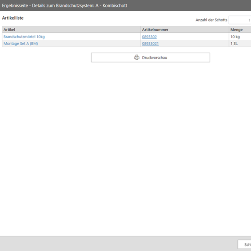 Auf der Ergebnisseite wird die Auswahl in eine Artikelliste übertragen.