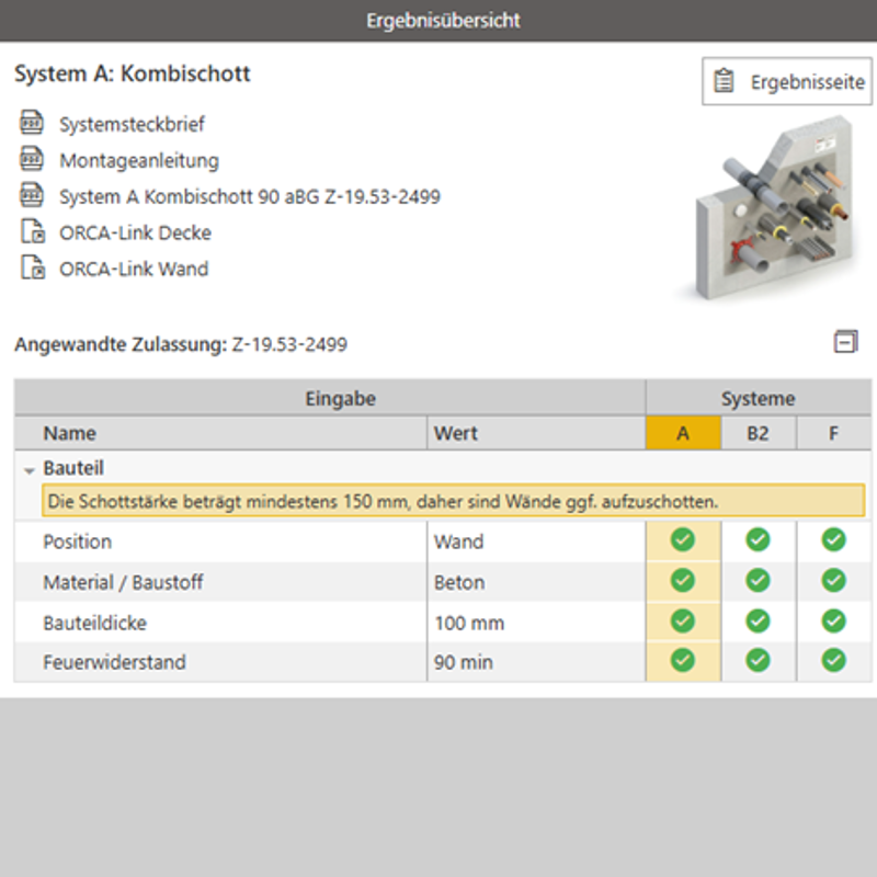 So erkennen Sie auf einen Blick, bei welchen Parametern Anpassungen erforderlich sind, um eine normgerechte Lösung zu erreichen. Neben dem ausgewählten System werden gleichzeitig weitere geeignete Alternativen angezeigt. Dadurch werden sofort praxisnahe Handlungsoptionen angezeigt.