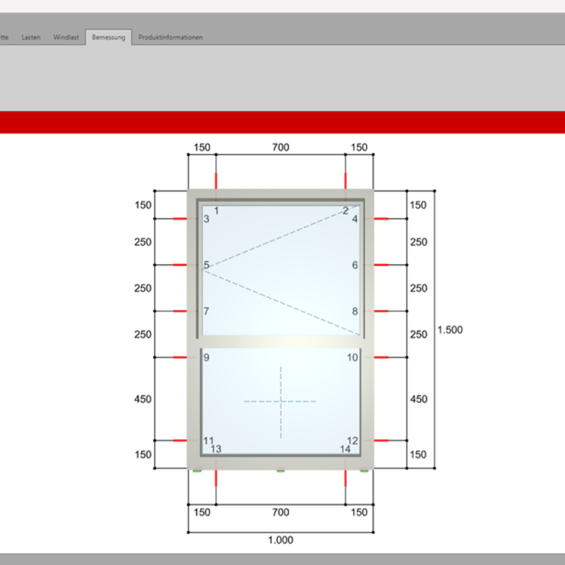 Hier werden Konstruktionsregeln aus der Statik oder der Montage beachtet. Abstände zur Fensterecke oder einem Holm bzw. Querriegel werden sinnvoll gewählt. Auch Mindestabstände, die sich aus dem Verankerungsgrund ergeben, werden berücksichtigt. Zur Optimierung kann der Nutzer diese Maße auch individuell für seine Bedürfnisse anpassen.