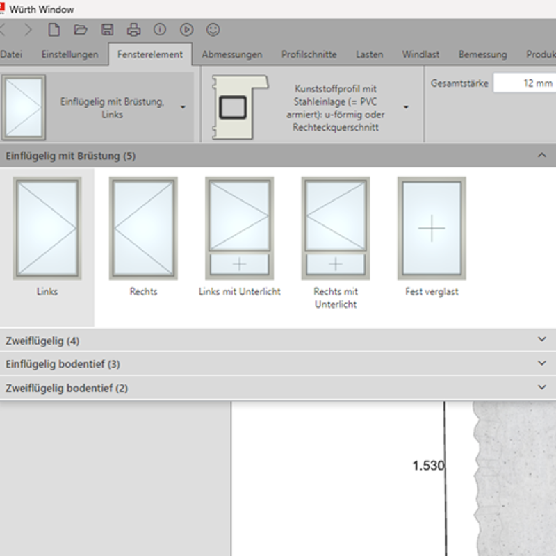 Über das Fenterelement können die Bauart sowie die Öffnungsrichtung ausgewählt werden.