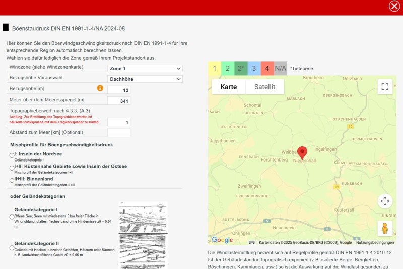Basierend auf Standortdaten, Windzonen und Schneelasten werden die Belastungen auf die Befestigungskonstruktion ermittelt: